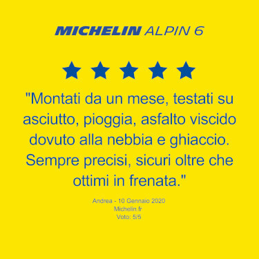 Acquista l’ultima generazione di MICHELIN Alpin 6, per un inverno in sicurezza, fatti per durare nelle critiche condizioni di guida invernali.(1)(2) Progettati per la miglior durata chilometrica(4) e dotati dell’utile indicatore di usura del battistrada MICHELIN, ti permettono di guidare senza compromessi grazie alle tecnologie sviluppate per offrirti frenata, aderenza e accelerazione su neve, dal primo all'ultimo chilometro(6). Questo inverno scegli MICHELIN Alpin 6 e affronta la strada con sicurezza.